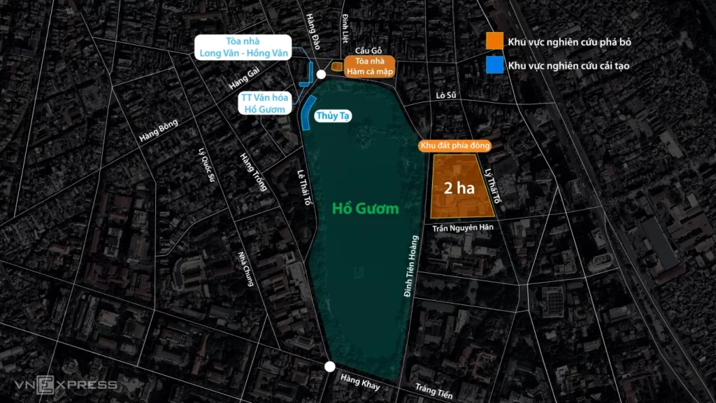 Hai khu vực nghiên cứu quy hoạch mở rộng không gian Hồ Gươm (màu vàng). Đồ họa: Đỗ Nam