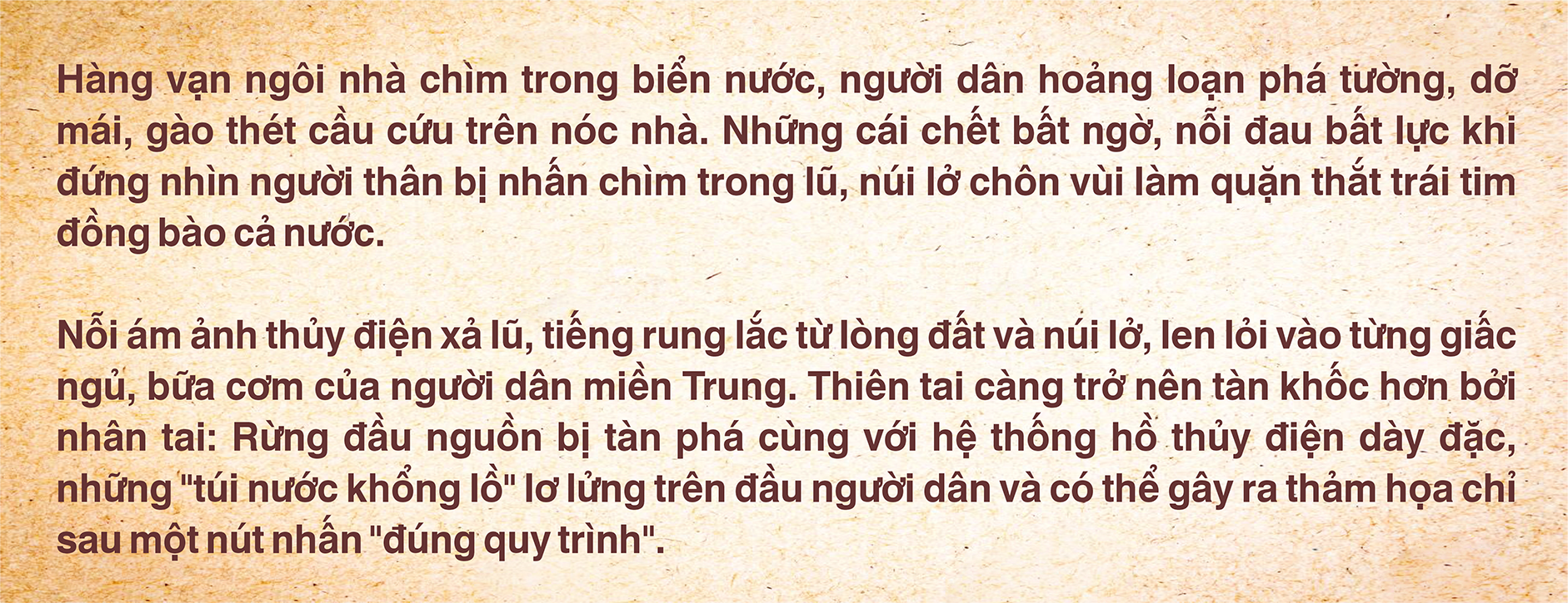 Những đợt mưa lũ lịch sử, bão lớn, sạt lở núi dồn dập ập đến tại miền Trung là điều chưa chưa từng xảy ra. Người dân vùng rốn lũ còn ám ảnh với tiếng còi hú cảnh báo thủy điện xả lũ cấp tập. Đồng bào miền núi lo lắng, bất an vì thảm họa sạt lở núi, đất chảy bất ngờ ập đến vùi lấp bản làng. Chúng tôi sẽ trở lại nội dung này trong bài tiếp theo.