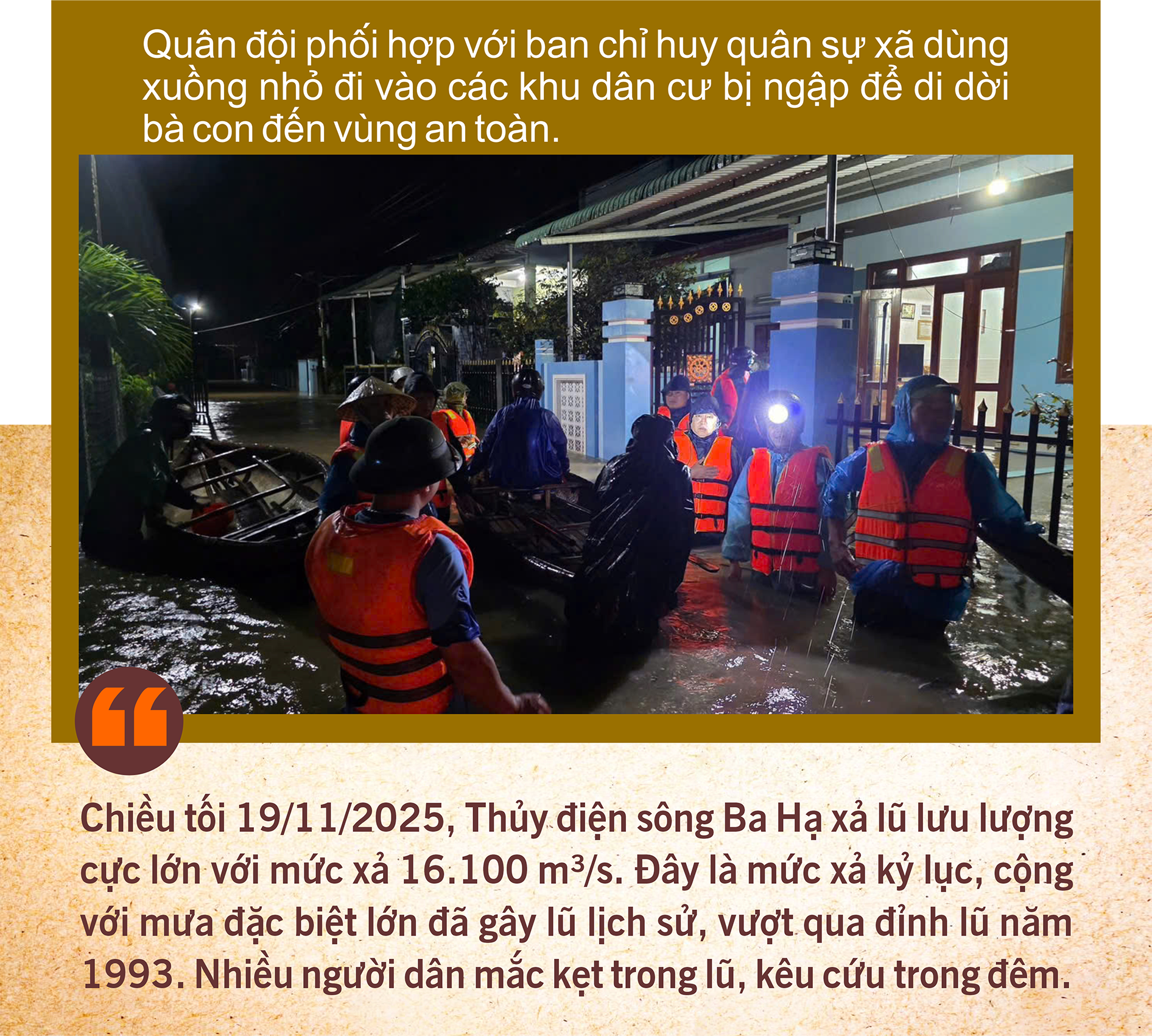 Chiều tối 19/11/2025, Thủy điện sông Ba Hạ xả lũ lưu lượng cực lớn với mức xả 16.100 m³/s. Đây là mức xả kỷ lục, cộng với mưa đặc biệt lớn đã gây lũ lịch sử, vượt qua đỉnh lũ năm 1993. Nhiều người dân mắc kẹt trong lũ, kêu cứu trong đêm.