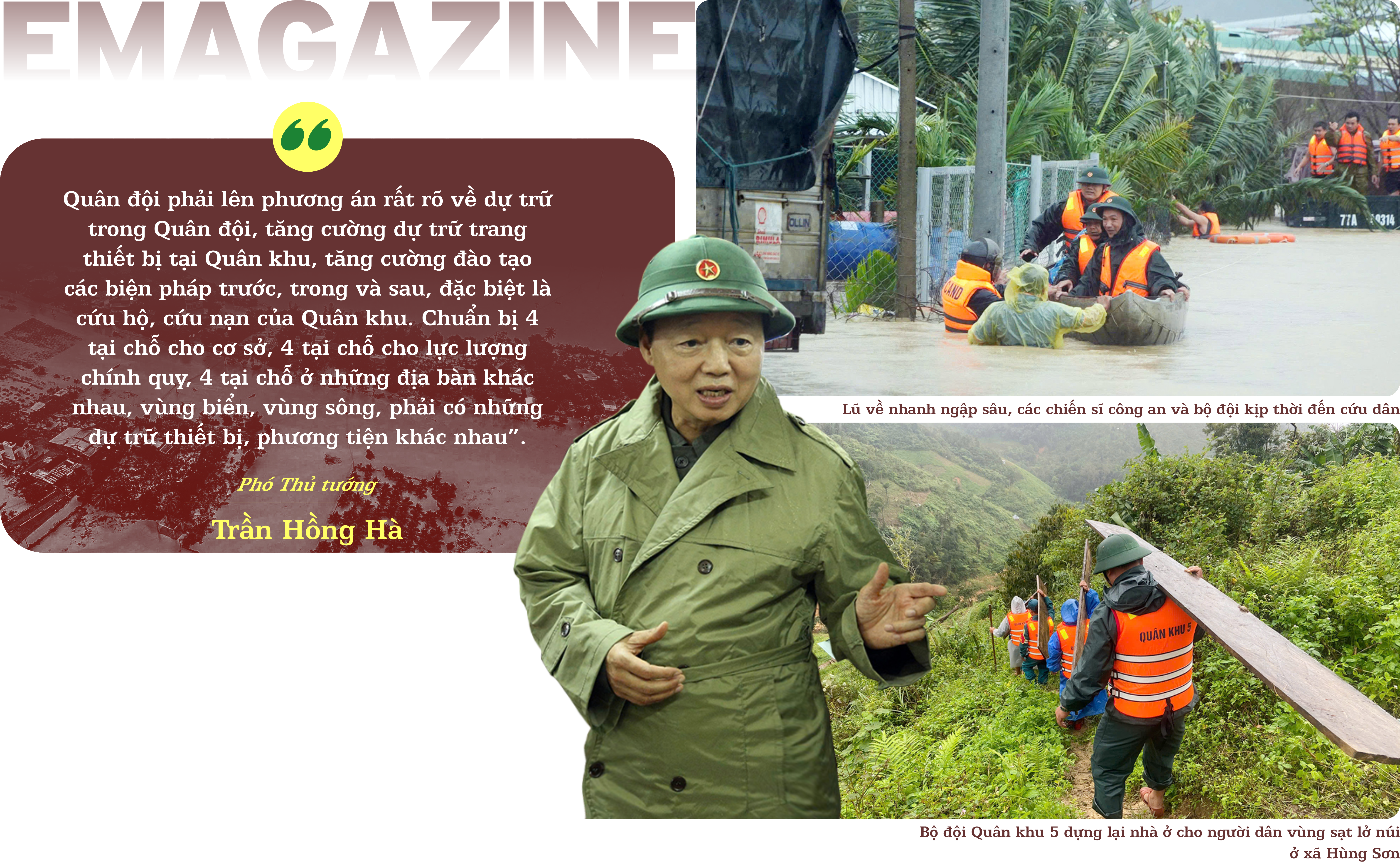 “Quân đội phải lên phương án rất rõ về dự trữ trong Quân đội, tăng cường dự trữ trang thiết bị tại quân khu, tăng cường đào tạo các biện pháp trước, trong và sau, đặc biệt là cứu hộ, cứu nạn của quân khu. Chuẩn bị 4 tại chỗ cho cơ sở, 4 tại chỗ cho lực lượng chính quy, 4 tại chỗ ở những địa bàn khác nhau, vùng biển, vùng sông, phải có những dự trữ thiết bị, phương tiện khác nhau”, Phó Thủ tướng Trần Hồng Hà nhấn mạnh.